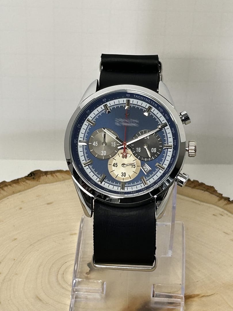 The Chronomaster Blue 42mm steel case and alligator strap is a mod homage tribute piece to the El Primero giving all the functions of a chronograph, date and tachymeter.