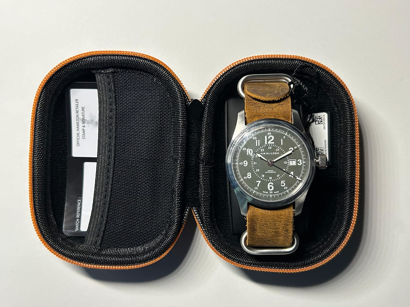 Climbing mountains, trekking through the forest or negotiating the urban jungle: The Khaki Field Auto is equal to your needs out in the field. With the exclusive H-10 automatic caliber offering up to 80 hours of power reserve, it won’t let you down. The Khaki Field watch sports a three-hand movement with a date function and boasting a superior power reserve of 80 hours, the H-10 appears with intricate contrasting snail and pearled patterns for the American Classic models it drives and streamlined surfaces for the pilots’ watches. Comes with rugged carrying pouch.