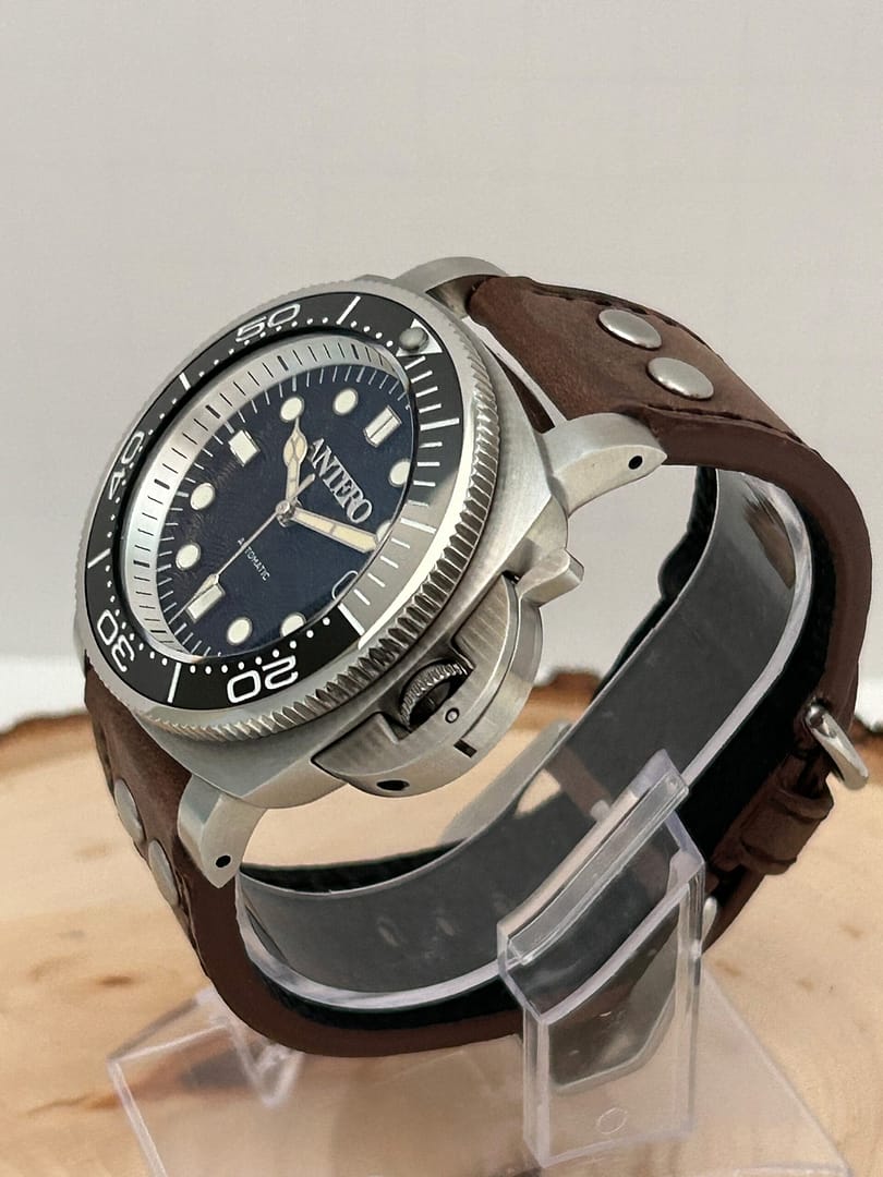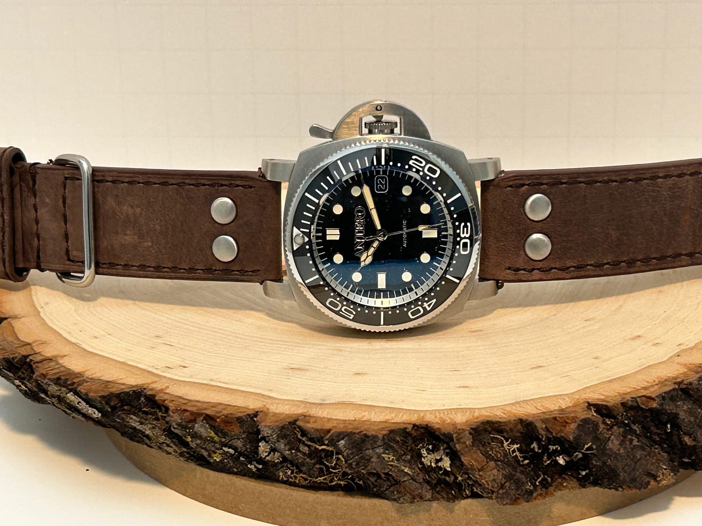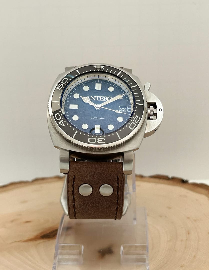 Double-domed blue edge anti-reflection premium sapphire crystal designed for small beveled edge ensuring a visible watch dial at any angle with no distortion.