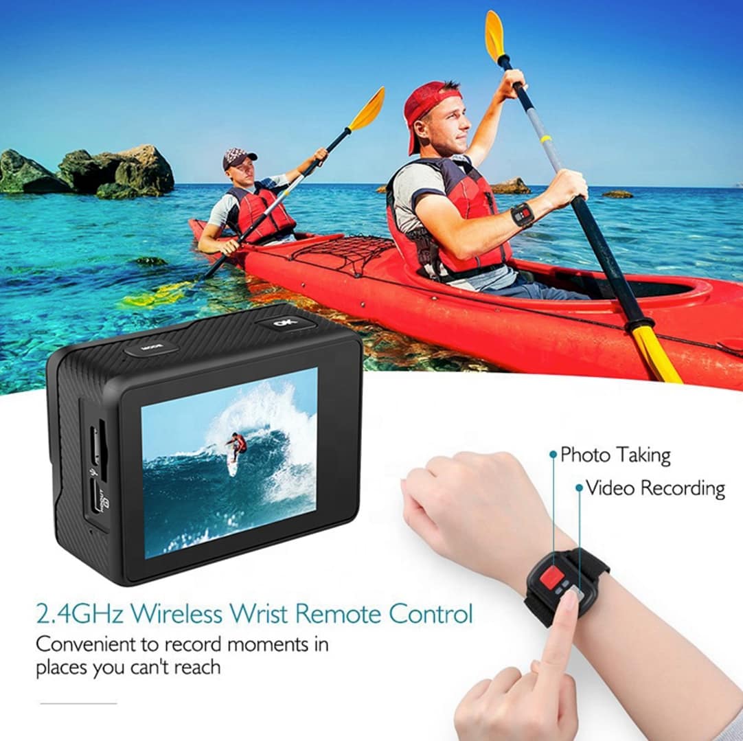 The VisPro Sport 4K Action Camera is equipped with Dual Monitor Ultra HD 4K 60fps 24MP Wifi Sport Camera 2.0” IPS Screen 170D Wide Angel Go Waterproof Pro Sports Video Camera and 2.4G remote control.